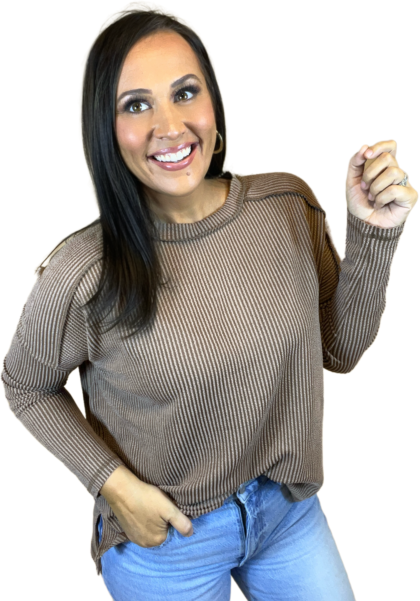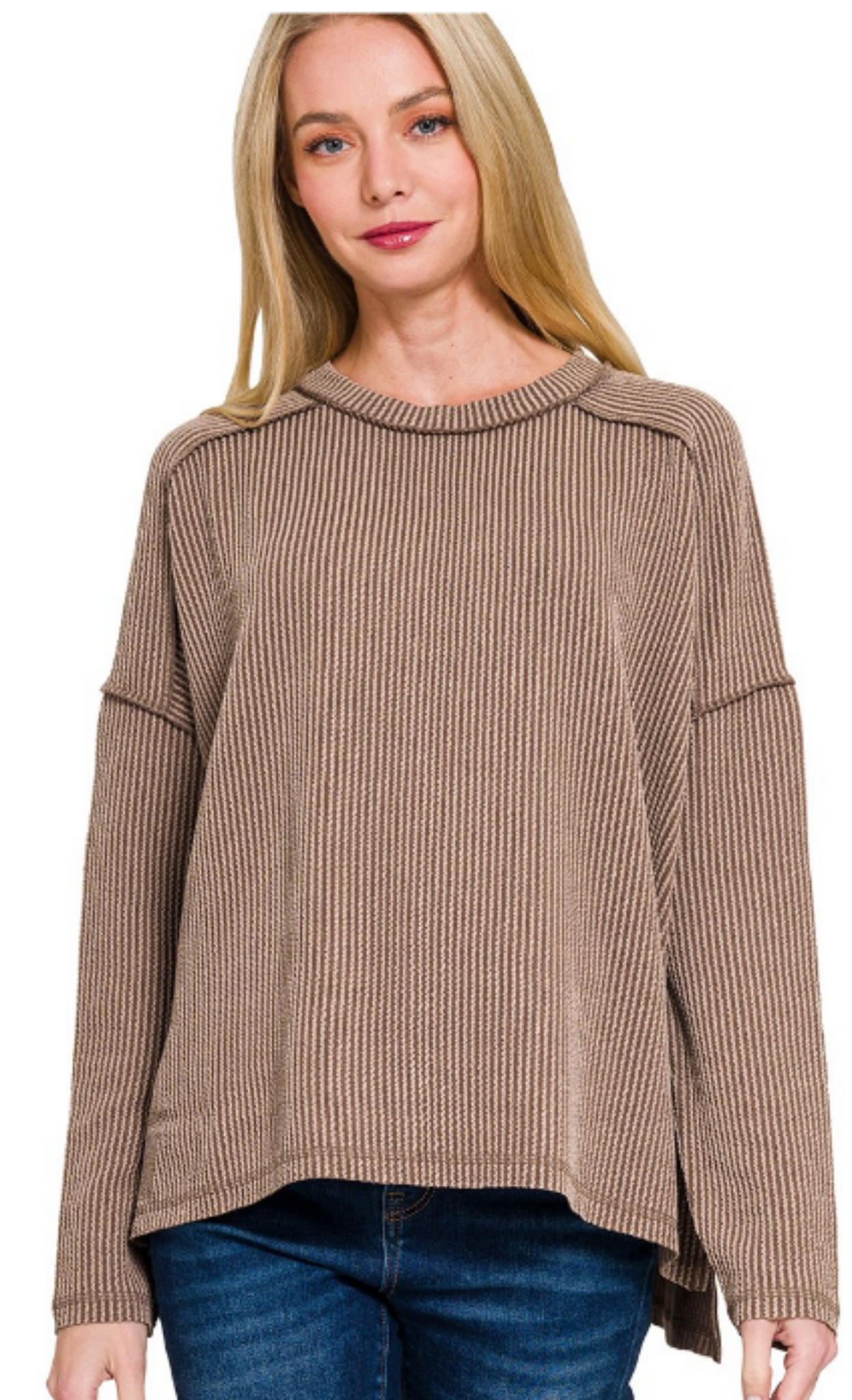 RAISED RIB RAW EDGE BOAT NECK LONG SLEEVE TOP