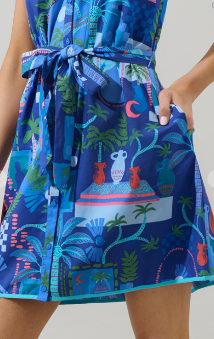 The Ibiza Ruffle Mini Dress is all you need for a perfect day look. It features layered ruffle cap sleeves with a button down front and a belt around the waist. It has pockets on each side.