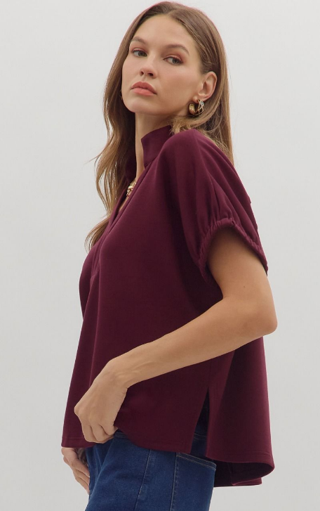 Solid short sleeve top featuring split V-neck with collar band. Elasticated sleeve openings. Back yoke with pleat detail. Unlined. Knit. Non-sheer. Lightweight.
