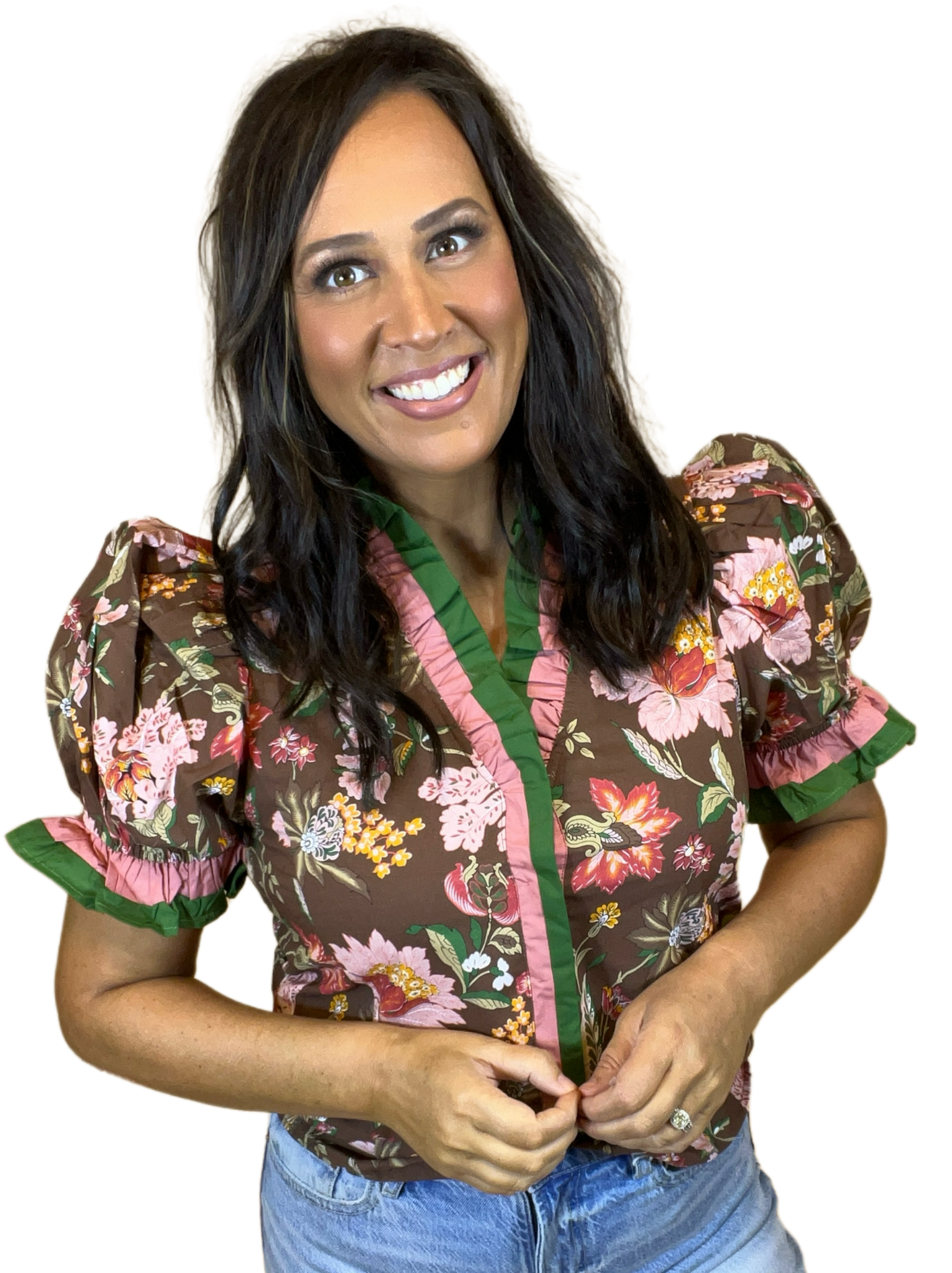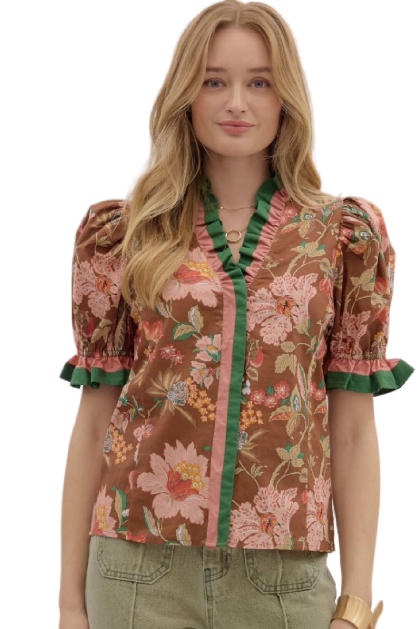 Floral print shoulder puff sleeve top featuring mulitcolor accent ruffle band detail. Unlined. Woven. Non-sheer. Lightweight.