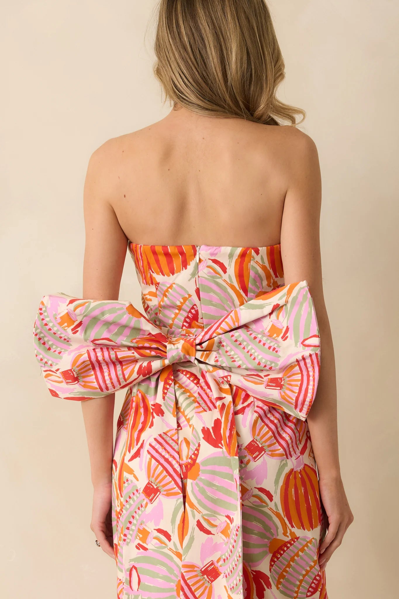 The Prosperina Lisette Pink Multi Cotton Ornament Print Strapless Midi Dress brings effortless drama with its vibrant pink multi ornament print, strapless neckline, and sculptural oversized bow. Crafted in soft cotton with a graceful drape and asymmetric hem, it strikes the perfect balance between playful and polished—made for moments when you want to stand out with ease. This pink multi-color strapless midi dress is crafted from a printed cotton-blend with slight stretch and features an oversized removable bow, an asymmetric hem, a concealed back zipper, and full lining for a structured yet breathable fit.