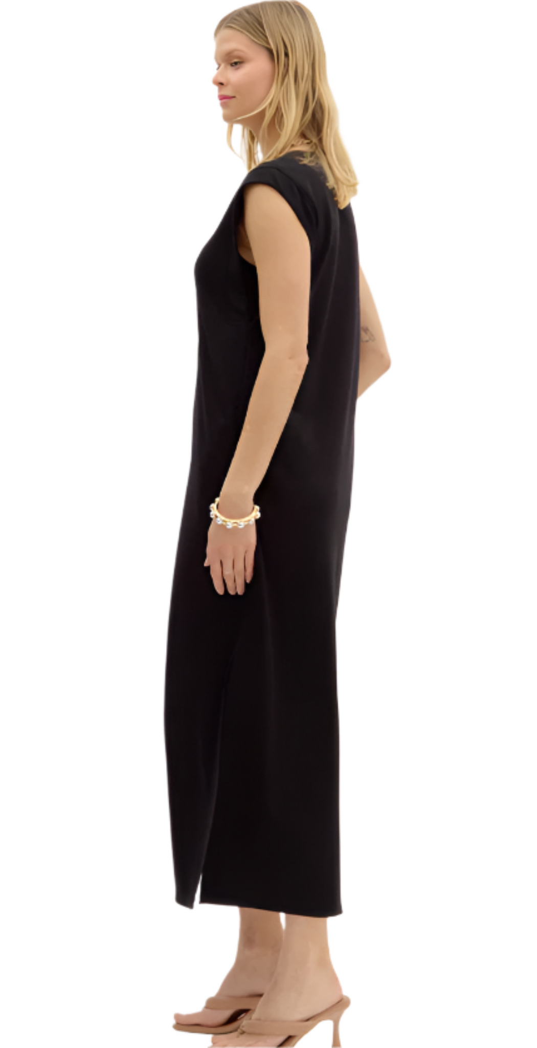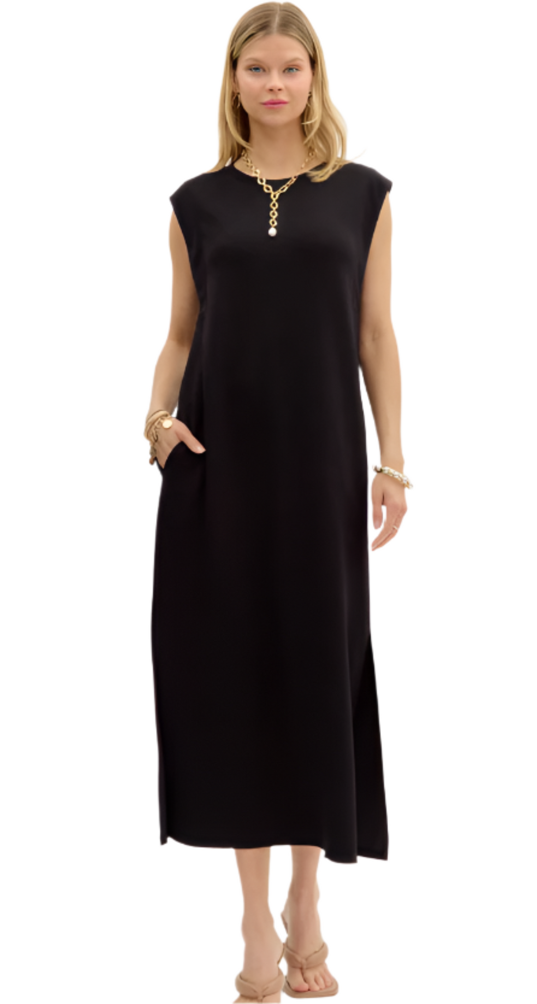Solid jersey knit pullover midi dress featuring side slit hem. Pockets at sides. Unlined. Knit. Non-sheer. Lightweight.