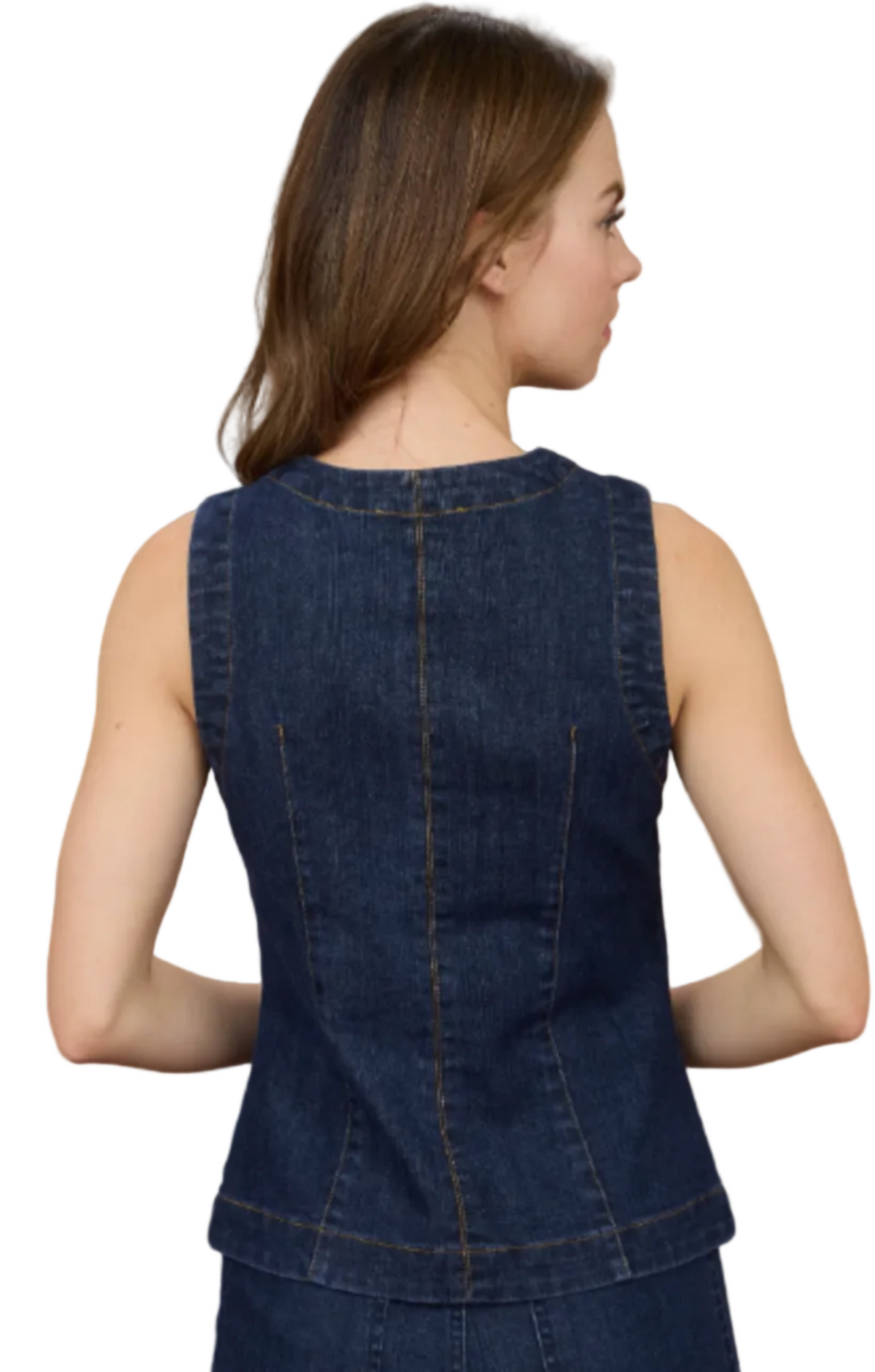 The Sawyer Vest combines timeless denim styling with modern versatility. This sleeveless button-down features a classic round neckline and functional buttons for easy layering. The split hem adds contemporary movement, while the unlined construction keeps it lightweight and breathable. Crafted from a durable cotton-blend fabric with subtle stretch, this piece pairs effortlessly with the Cyrus Trouser Jeans for a polished, coordinated look. Natural tone variations enhance its authentic denim character.