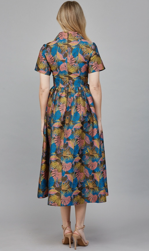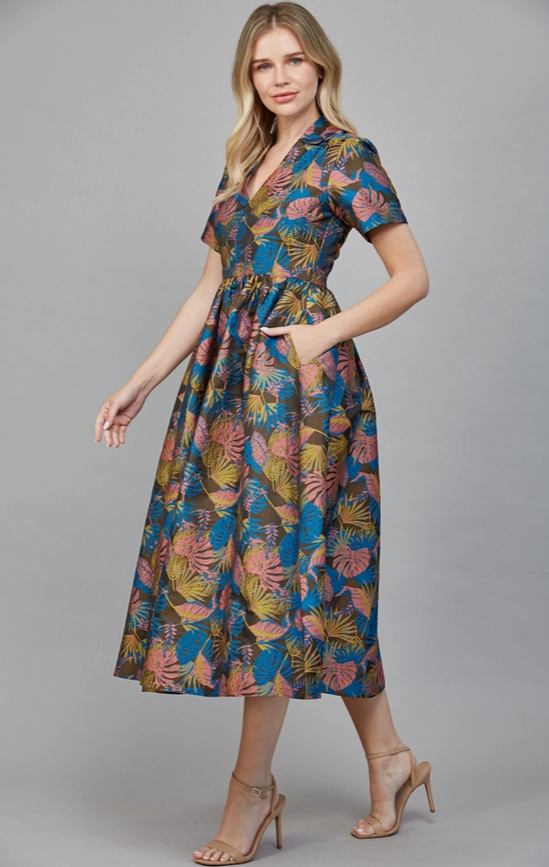 Collared v-neckline jacquard fabric midi dress S:100%poly / l:97%poly 3%span