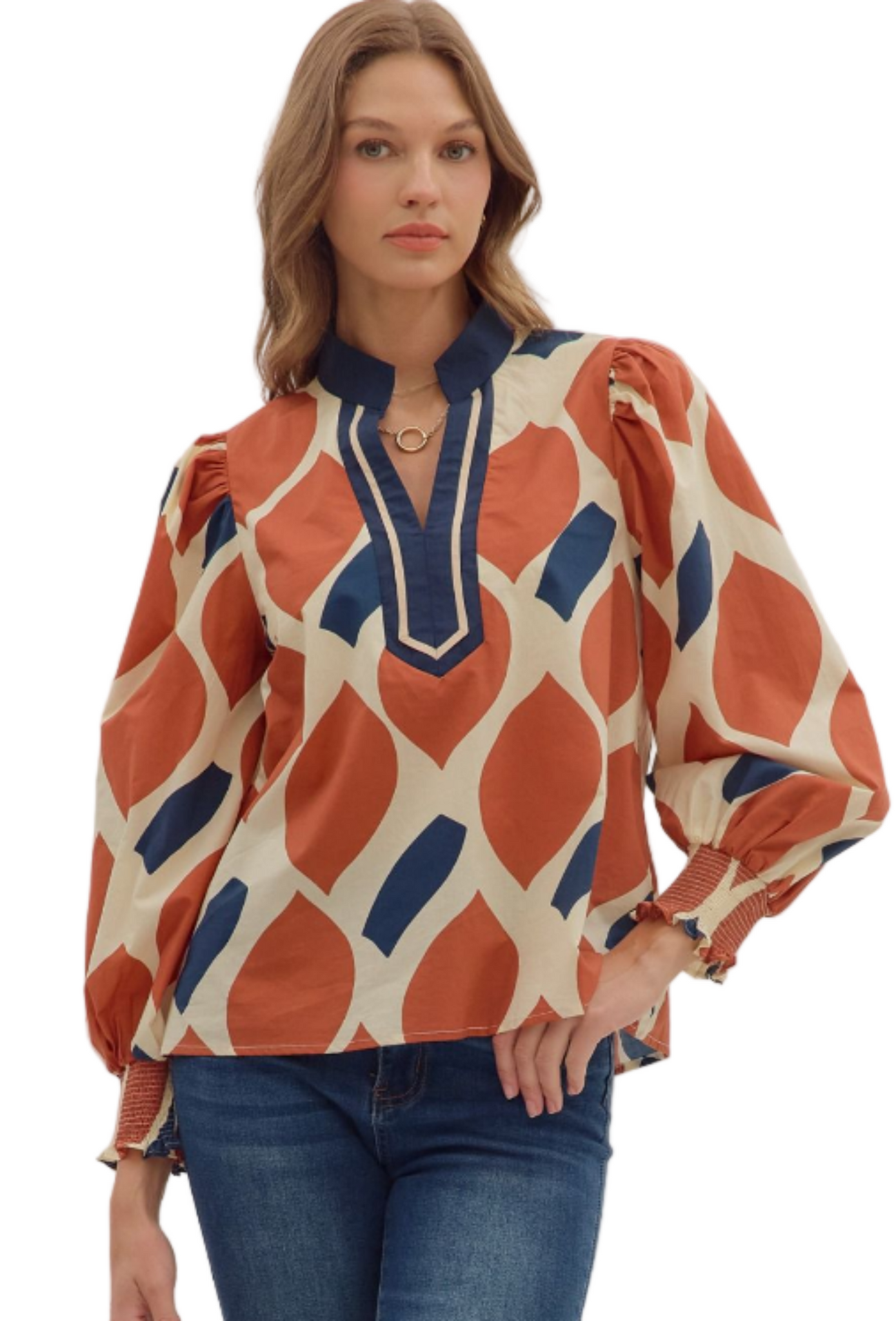 Geometric print long sleeve top featuring contrast split neck with band collar and smocked cuffs with lettuce edge. Unlined. Woven. Non-sheer. Lightweight.