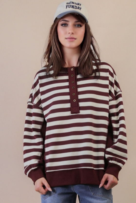 - Oversized Striped Half Button Down Casual Knit Top - Drop Shoulder - Round Neck - Long Sleeve - Raw Edge Detail