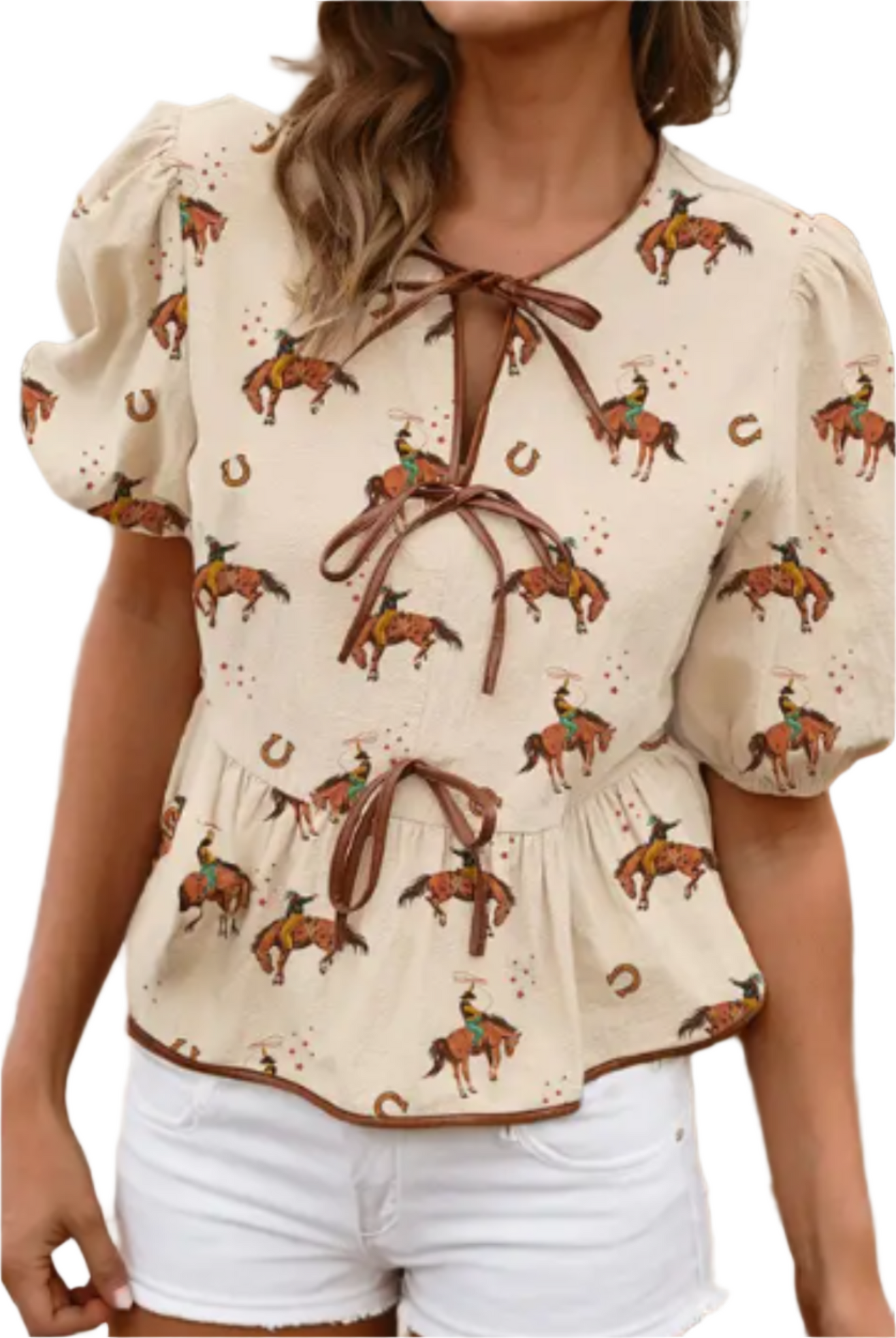 Cowboy Print Puff Sleeve Bowknot Babydoll Blouse