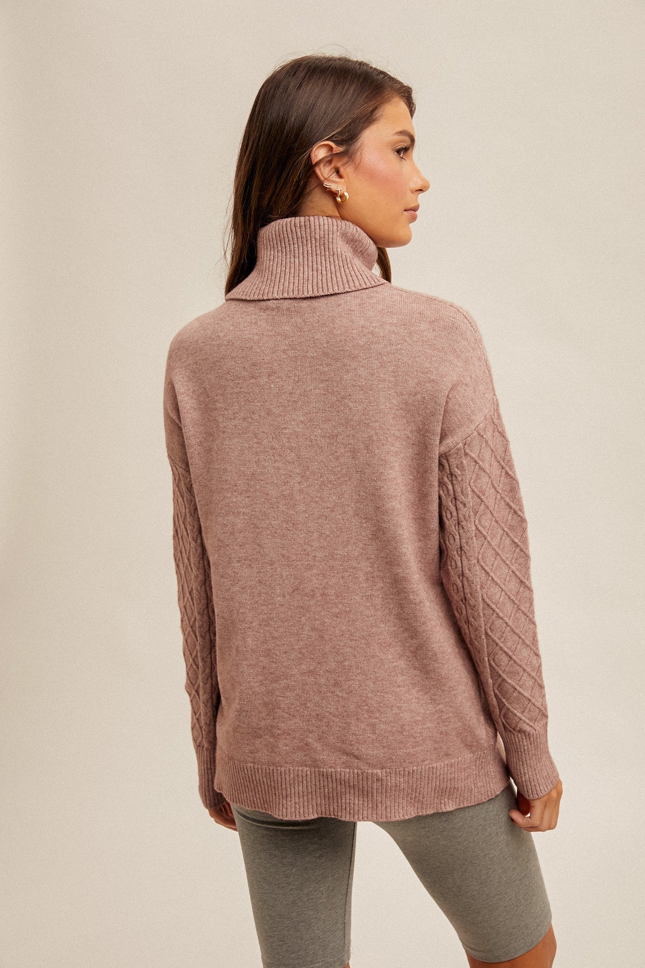 CABLE KNIT SPLIT HEM TURTLE NECK SWEATER -50% VISCOSE 28% POLYESTER 22% NYLON