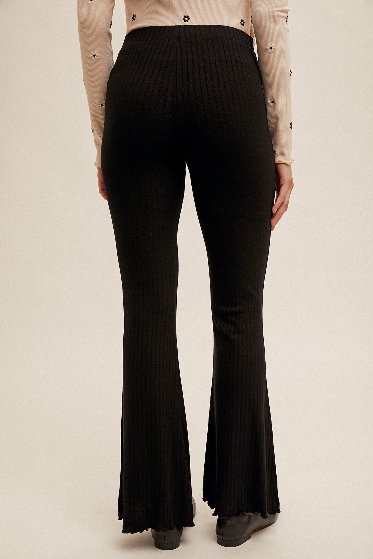 CABBAGE HEM RIBBED FLARE PANTS -94% RAYON 6% SPANDEX
